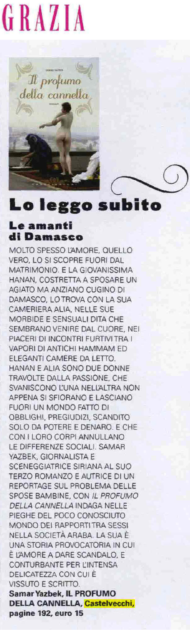 On May 17th 2010, the Italian leading magazine Grazia reviewed Samar Yazbek’s novel, Cinnamon, recently published by Castelvecchi.