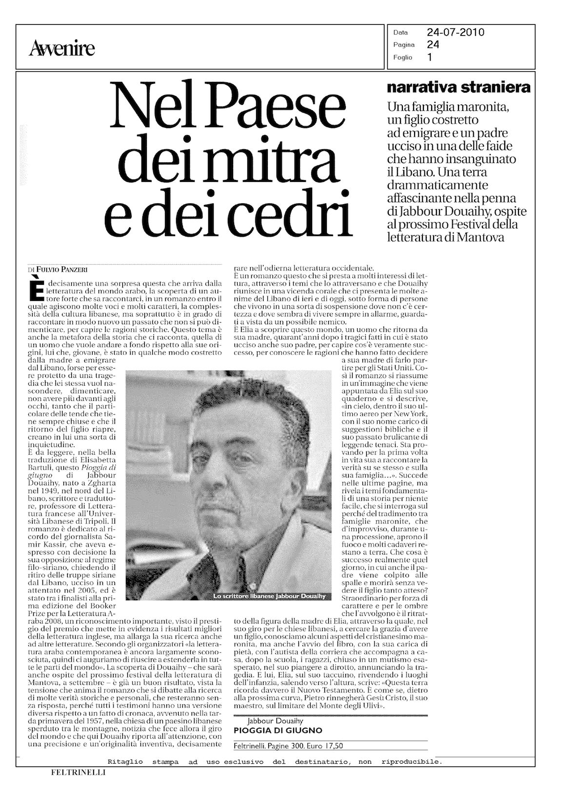 Italian review of Douaihy’s June Rain, in Awenire