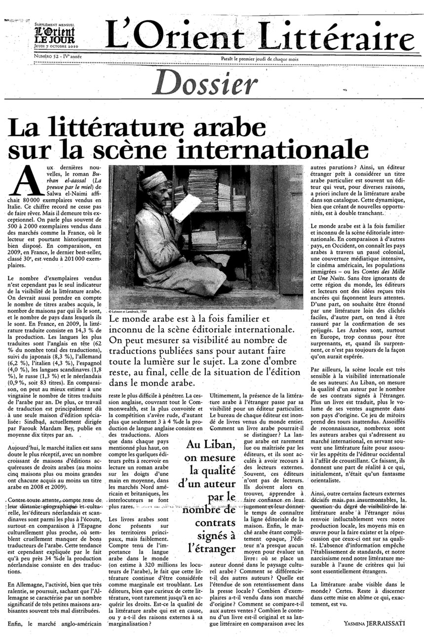 Last time I checked, Salwa El Naimi’s novel ‘Burhan el aassal’ (Proof of the honey) sold 80,000 copies in Italy (1). This record-breaking figure is rarely heard of for Arabic literature in translation. Sales numbers commonly range from 500 to 2000 copies in markets like France, despite the fact that French readers are historically well inclined towards this literature. Comparatively, in 2009, the 30th ranked best seller sold 201,000 copies (2) in France.